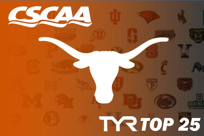 Fresh off wins against #17 Arizona, the University of Texas Longhorns continue to lead the CSCAA / TYR Top 25.