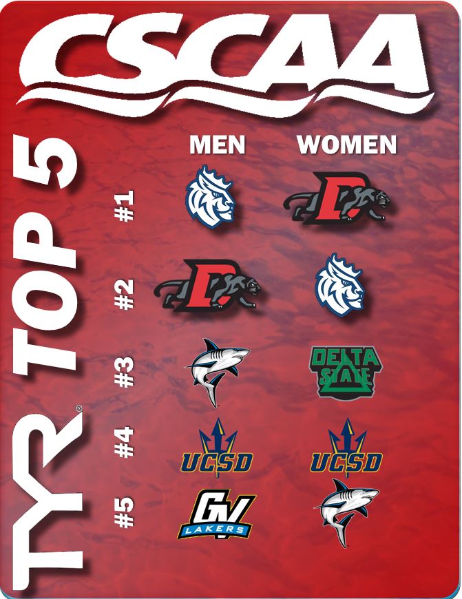 A week out of the conference championships, the Queens University of Charlotte Men and Drury University Women remained atop the CSCAA/TYR NCAA Division II Swimming & Diving Poll. The Royals have held onto the top spot in the men’s poll since November 16th while the Panther women have held onto number one since the season’s first poll
