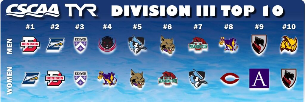 Entering the Conference Championship Season, the Denison University Men and Emory University women remain atop the CSCAA / TYR Top 25 Division III Swimming & Diving Poll. The two teams have occupied the top spot since the season’s first poll back in October.
