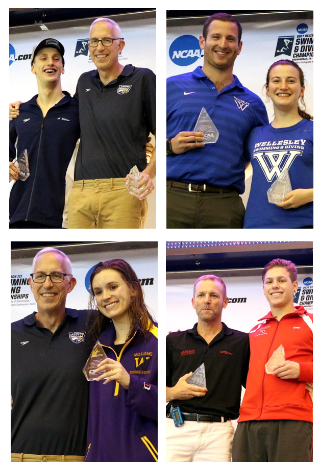 The College Swimming and Diving Coaches Association of America (CSCAA) awarded its NCAA Division III Swimming and Diving Awards Saturday Evening at the ISD Conroe Natatorium in Shenandoah, Texas. In an interesting twist, three of the four athletes earning the annual awards did so after previously winning the award in 2015.