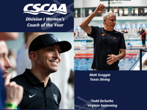 Texas Coach Matt Scoggin has been named Women’s CSCAA Diving Coach of the Year, earning the honor for the sixth time. Under his leadership, Texas had three divers score in both the 1-meter and 3-meter events, along with two athletes scoring on the platform. Scoggin also guided Alejandra Estudillo to a championship victory in the 3-meter event.