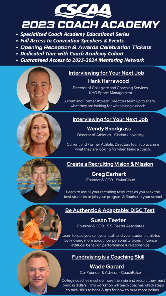 If you, or one of your staff members, are looking to amplify the educational and networking experience that occurs at the CSCAA Convention & Annual Meetings, then you should join the 2023 Coach Academy cohort. The 2023 Coach Academy consists of 8-10 hours of intensive education dedicated to exploring all areas of the coaching profession. […]