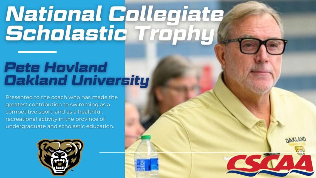 Pete Hovland, Head Coach of Oakland University, has been selected by members of the CSCAA for the 2022 National Collegiate Scholastic Trophy, in recognition of his contributions to college swimming. He will be recognized at the 62nd Annual CSCAA Awards Celebration on May 8th, in Orlando, Florida.