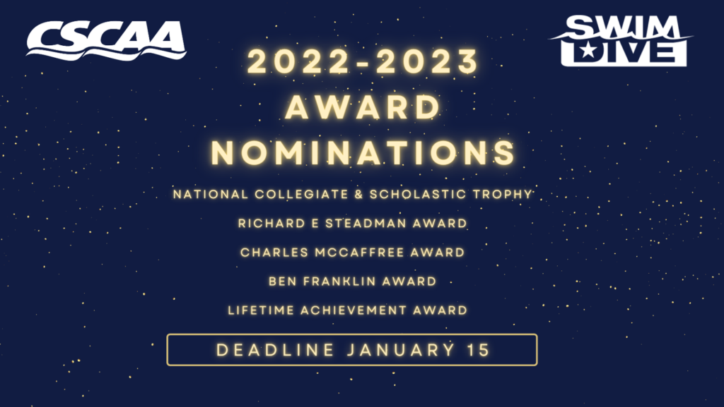 The College Swimming & Diving Coaches Association of America opened nominations for the organization’s five most prestigious recognitions, listed below. The CSCAA honors individuals each year during the CSCAA Annual Meeting. The 2023 CSCAA Annual Meetings are scheduled to take place in Orlando, Florida.