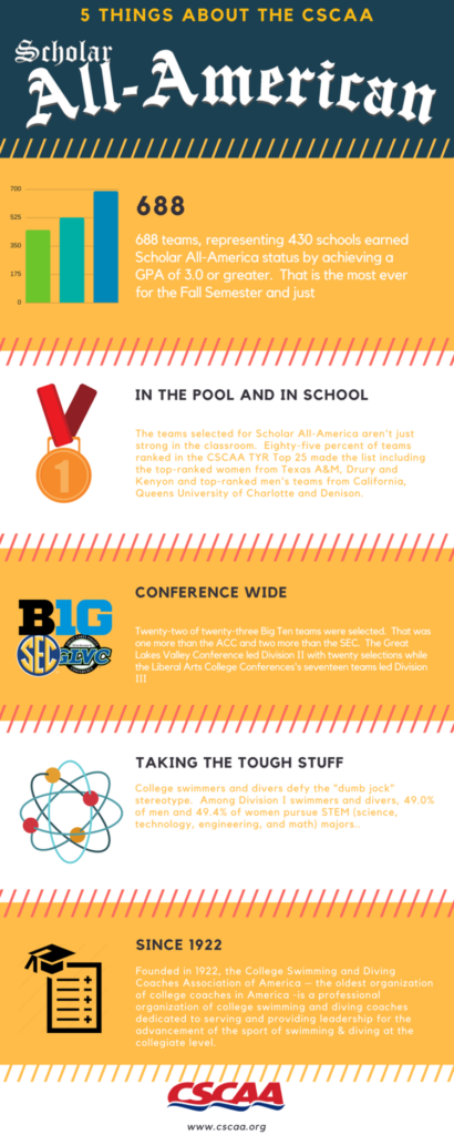 The College Swimming and Diving Coaches Association of America has announced the 688 teams that have earned the distinction of Scholar All-America team for the Fall 2017 semester.