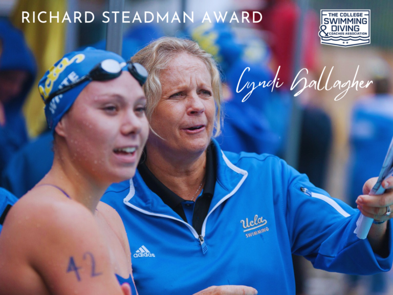 January 14, 2025 — The College Swimming and Diving Coaches Association of America (CSCAA) proudly announces Cyndi Gallagher as the 2026 recipient of the prestigious Richard E. Steadman Award. The honor is conferred annually to a swimming or diving coach in high school, club, or university ranks who has done the most to spread happiness in Coach Steadman’s beloved sport of swimming and diving.