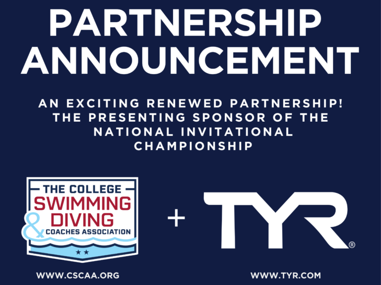 December 22, 2025— The College Swimming & Diving Coaches Association of America (CSCAA) is proud to announce a renewed multi-year partnership with TYR, extending through 2029. As part of the renewed agreement, TYR will serve as the Presenting Sponsor of the CSCAA National Invitational Championship (NIC), the largest postseason collegiate swimming and diving championship in the sport.