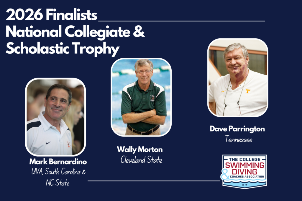 December 9, 2025 – The finalists for the National Collegiate and Scholastic Trophy were announced today by the College Swimming and Diving Coaches Association of America (CSCAA). The trophy is awarded by both the CSCAA and National Interscholastic Swimming Coaches Association (NISCA). It is the highest honor in intercollegiate and interscholastic swimming & diving, and is awarded to the individual who has made “the greatest contribution to swimming and diving as a competitive sport, and as a healthful, recreational activity in the province of undergraduate and scholastic education.”